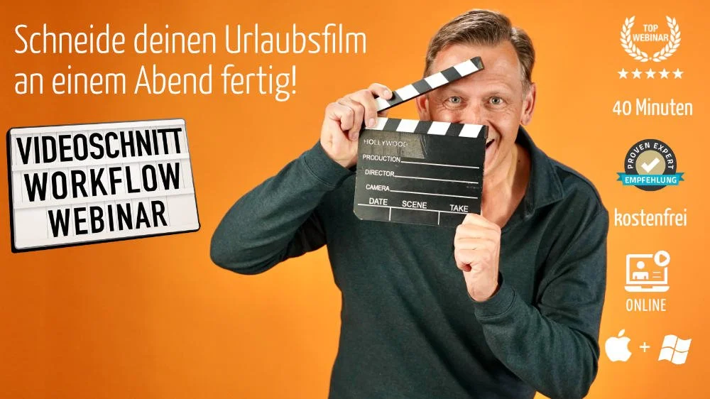 Melde dich jetzt hier zum kostenlosen Webinar an. So schneidest du deinen Urlaubsfilm an nur einem Abend: Videoschnitt-Workflow-Webinar